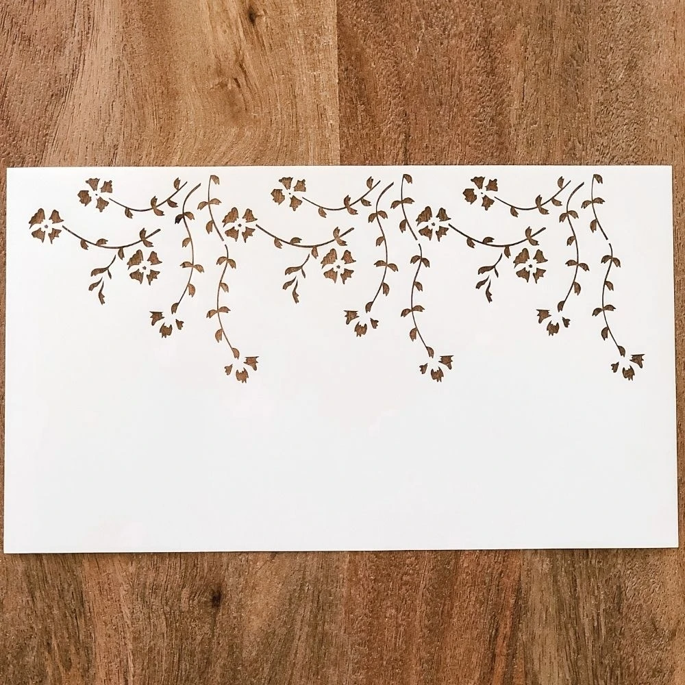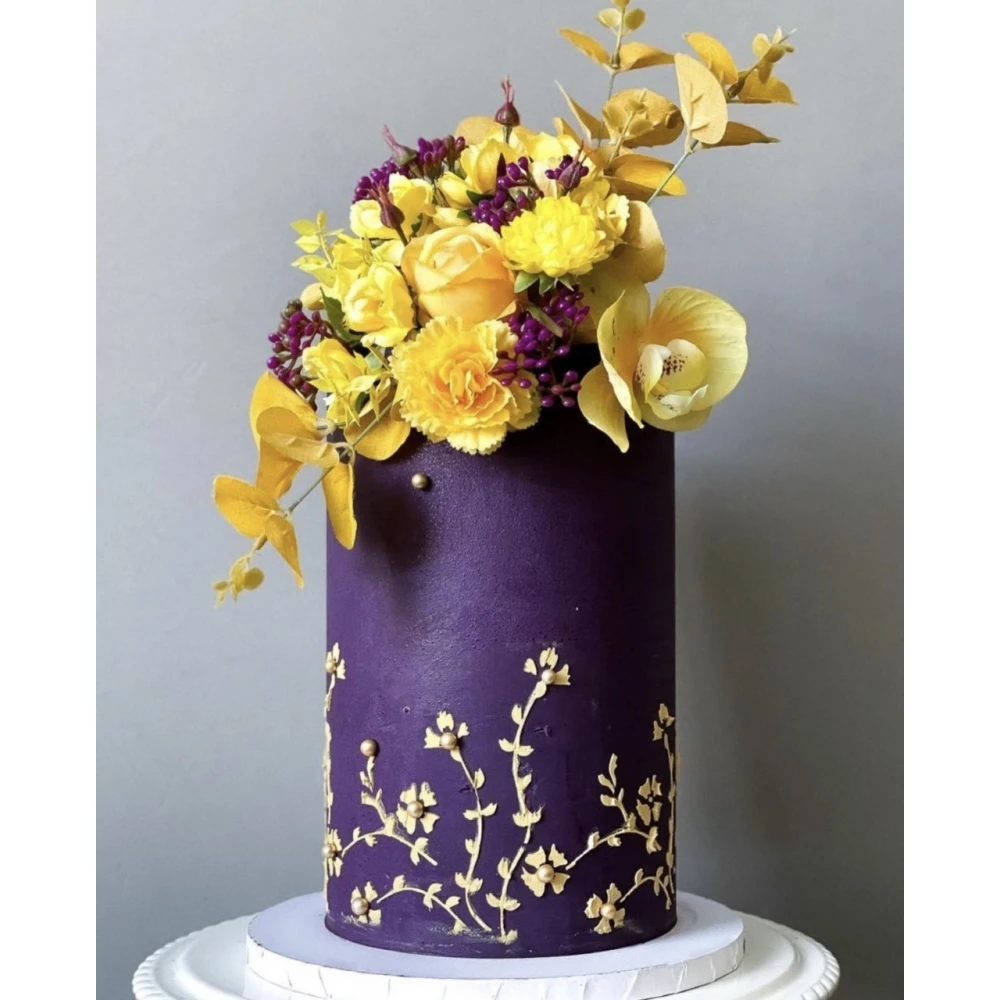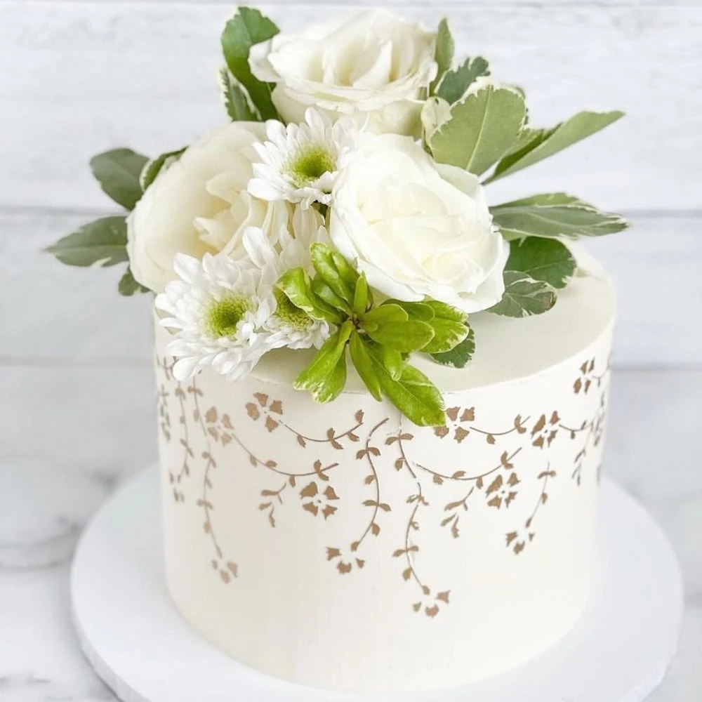 This gorgeous stencil design stems from a collection of stencils inspired by the trend of the organic-looking style of cakes that are becoming more and more popular. Beautiful, natural, and earthy, you’ll notice elements of wheat fields and lavenders, making it perfect for any nature-loving cake artist.
