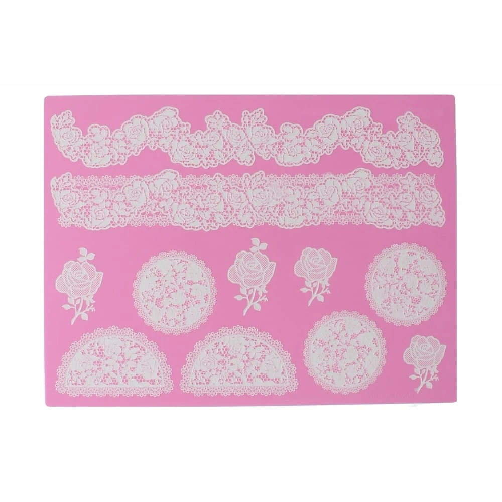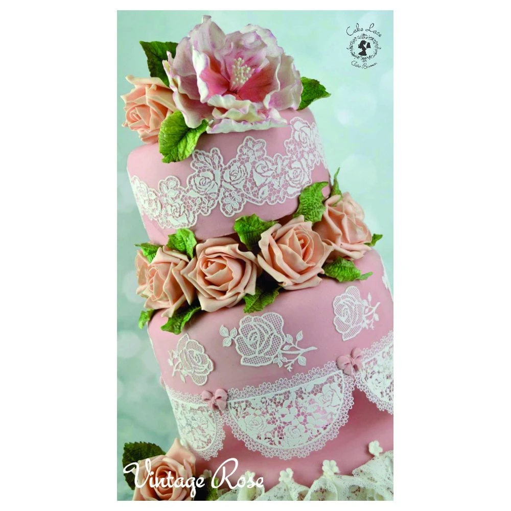 The Vintage Rose Cake Lace mat is a modern redesign of a traditional vintage floral design. The roses can be used as cupcake toppers, and the floral drapes as a beautiful border design.