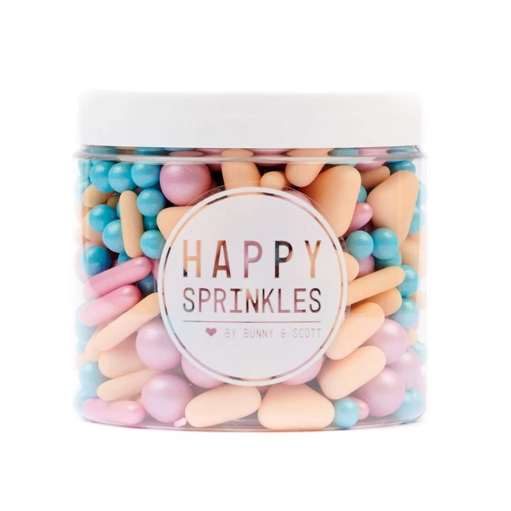 This sprinkle mix is the perfect combination of muted tones and pearlescent shimmer. Featuring pastel peach triangles, pearlescent pink rods, purple Choco balls and blue pearls, these sprinkles are great for bakes in need of a splash of colour.