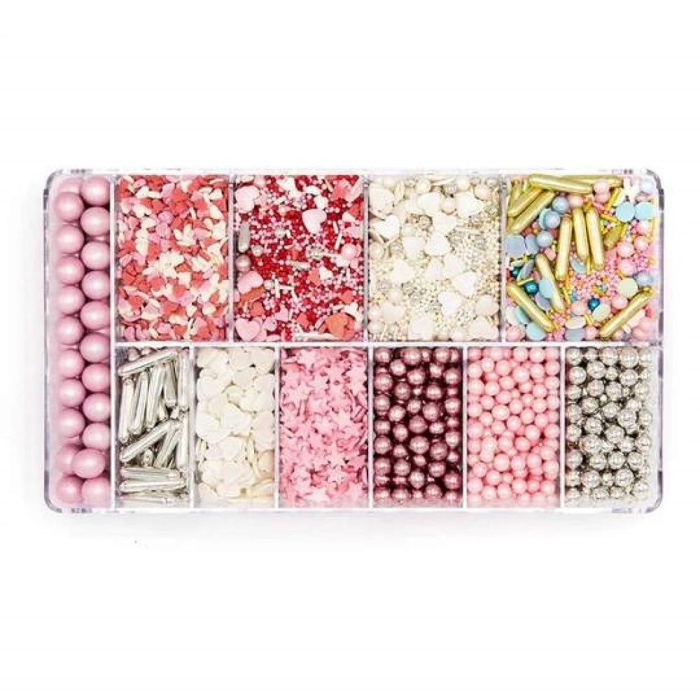 The box consists of 11 different designs, with some of your favourites including Be Mine, Dancing Queen, Happy Ever After, Confetti Lovehearts, White Confetti Hearts, Pink Confetti Stars, Pearlescent Pink Pearls, Metallic Pink/Silver Pearls, Metallic Silver Rods, and Pink Pearlized Pearls.