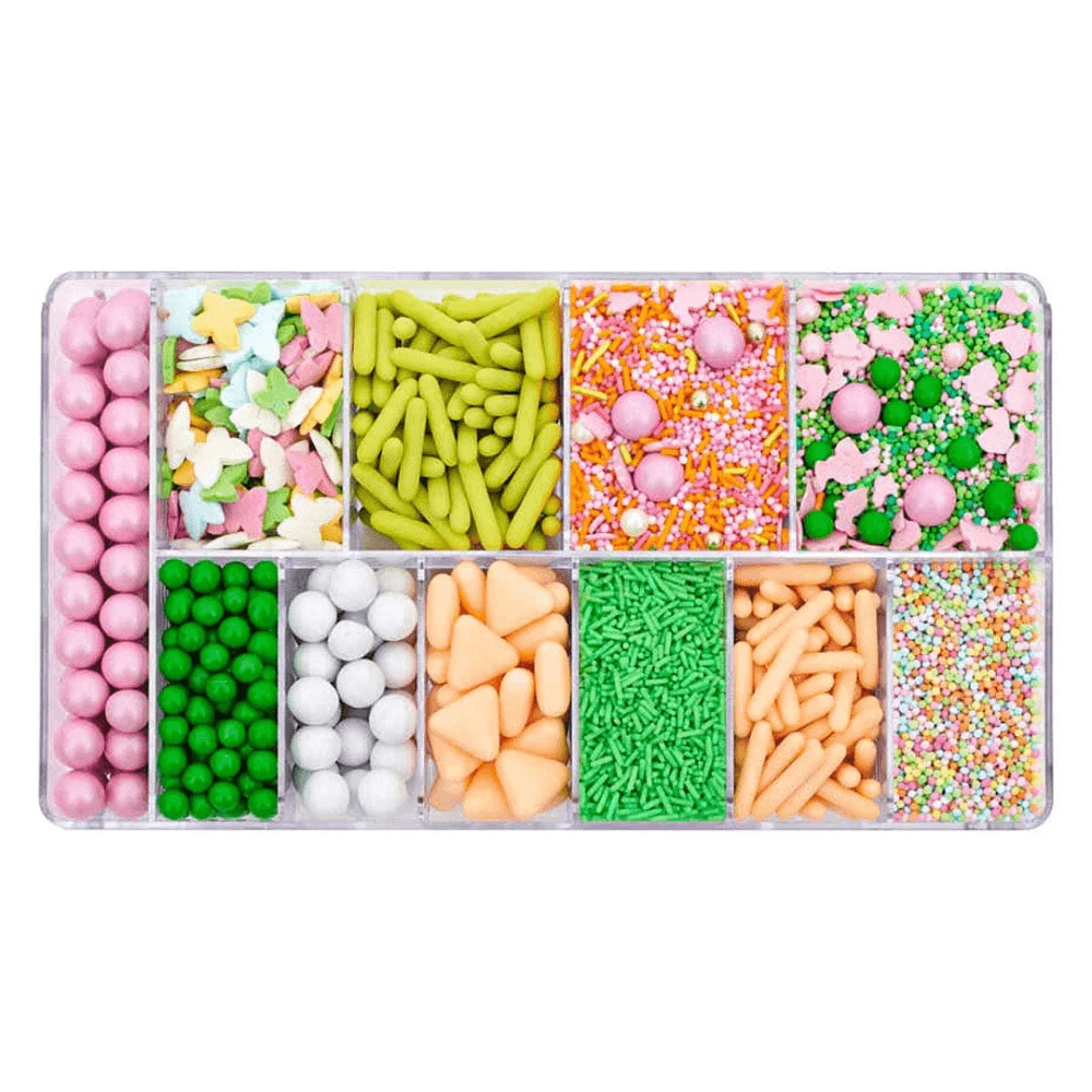 This spring-themed sprinkle collection includes 11 separate compartments of different sprinkle mixes, giving you a huge palette to work with when decorating your Easter bakes!