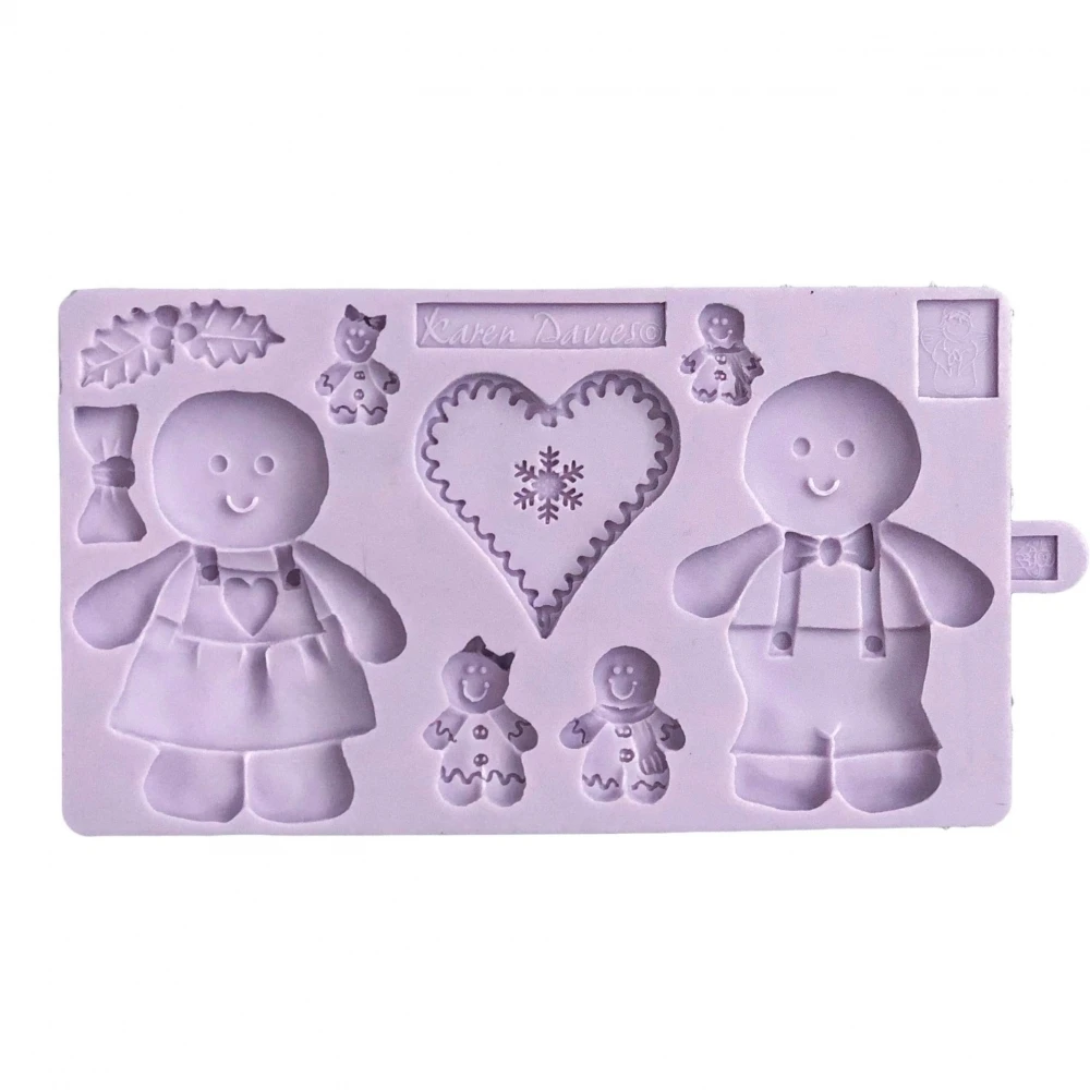 The mould includes: Gingerbread Man, Gingerbread Woman, 2 Gingerbread Children (boy and girl), Nordic Heart, Holly & Berries, Bows etc.