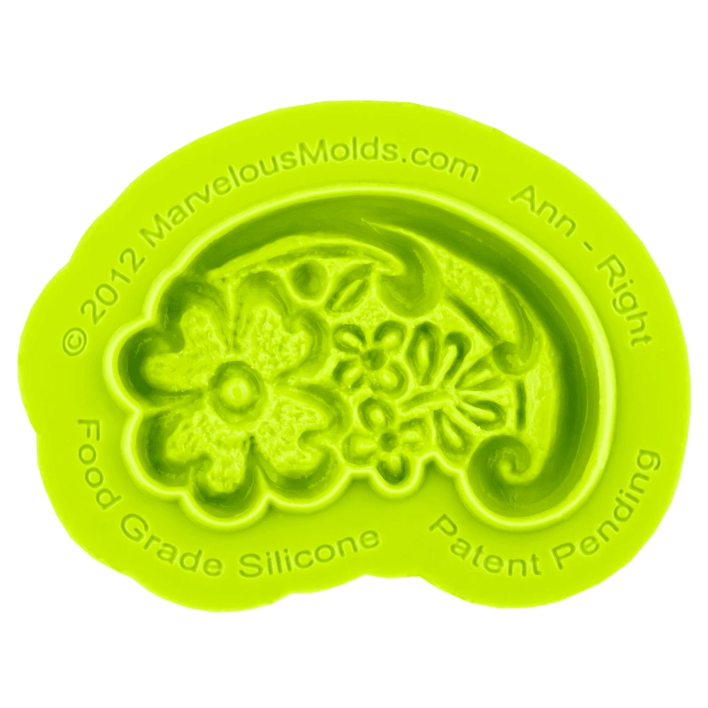 Ann Right is a Silicone Lace Mould with a self trimming blade and enhanced lace pattern using an arrangement of flowers bordered by a series of swirls.