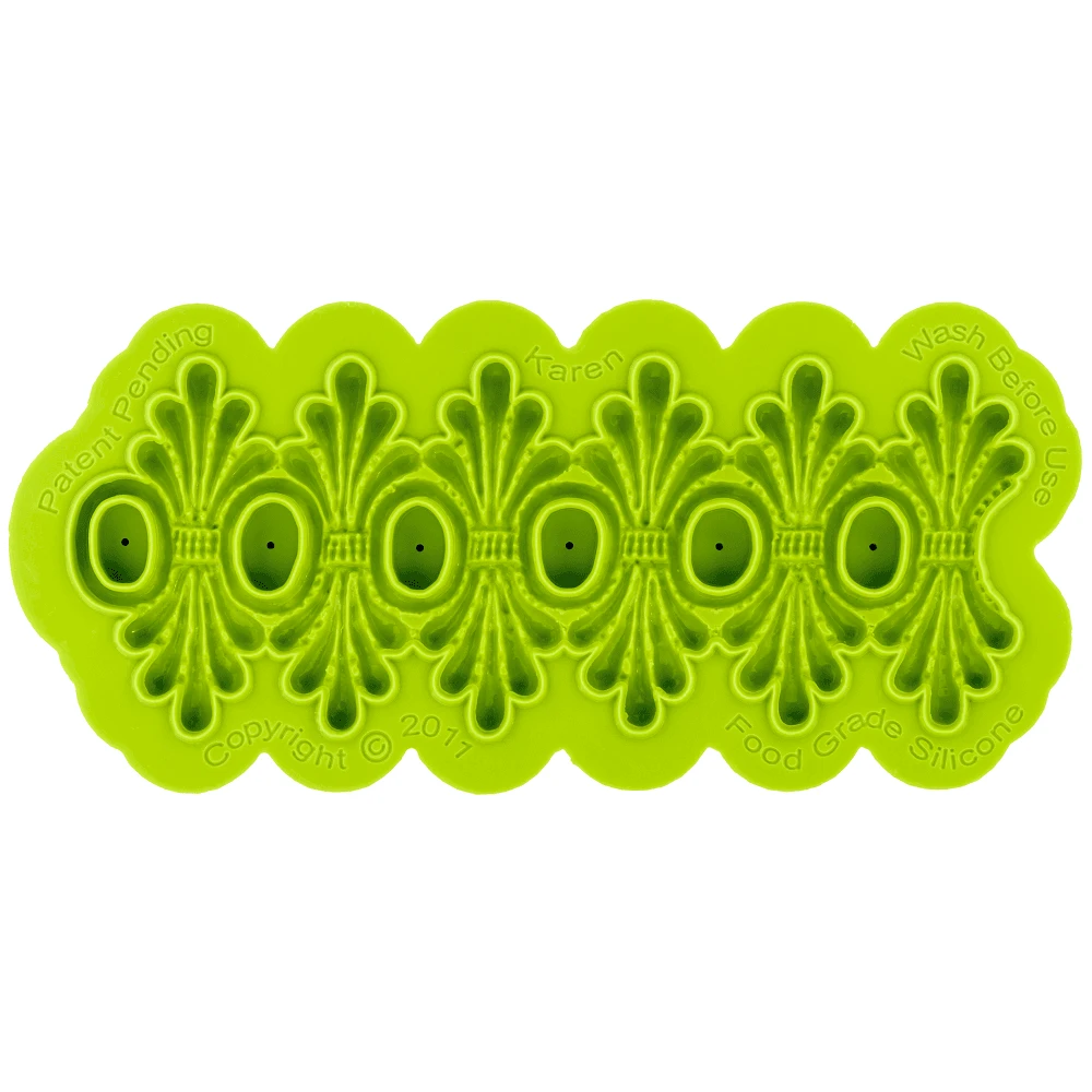 Karen is a Silicone Lace Mould with a self trimming blade and an enhanced lace pattern that uses a double border design and oval openings, which form a delicate lace border.